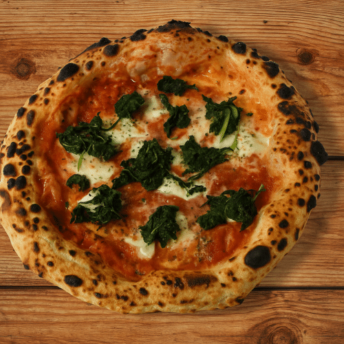 Knuspriger Rand, saftige italienische Salsiccia, frischer Spinat, cremiger Ricotta und aromatische Provola ein leicht geräucherter neapolitanischer Käse zum Schluss fein geriebener Pecorino.